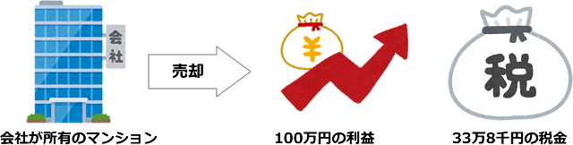 平成29年3月決算の会社が、所有しているマンションを売りました。譲渡価額から取得費(簿価)と譲渡するための経費を控除したところ譲渡益が100万円でありました。実効税率が33.8%なら法人税は338,000円です。