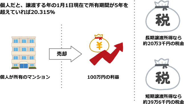 個人で所有しているマンションを売って同様の譲渡益がでると、譲渡する年の1月1日現在で所有期間が5年を超えている長期譲渡所得ならば税率は20.315%、5年以下なら39.63%(短期譲渡所得)です。